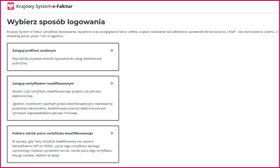 Uwaga: Logowanie może nastąpić przy użyciu Profilu Zaufanego, Certyfikatu kwalifikowanego lub odcisku palca certyfikatu kwalifikowanego.