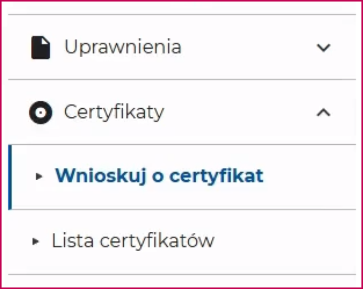 3. Przejdź do sekcji Certyfikaty, która znajduje się w głównym menu. Wybierz podzakładkę Wnioskuj o certyfikat.