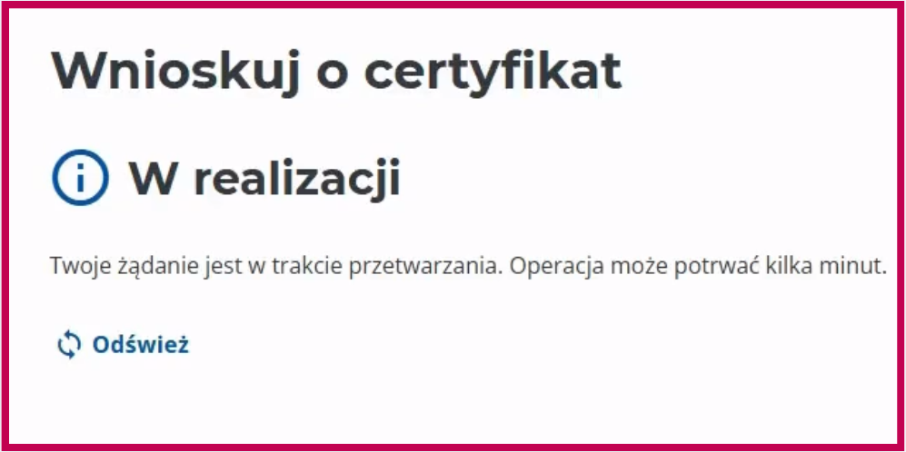 6. Po wypełnieniu kliknij Wyślij wniosek o wydanie certyfikatu - uruchomi to proces wydawania certyfikatu KSeF. Proces może potrwać kilka minut. Możesz użyć przycisku Odśwież, aby sprawdzić status.