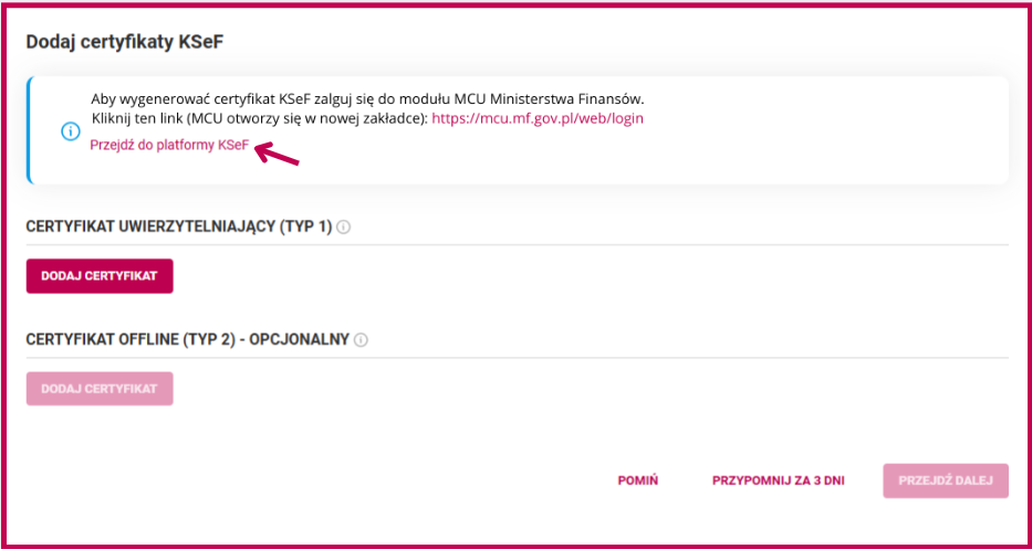 2. Wybierz opcję Przejdź do platformy KSeF w celu zalogowania się do Modułu Certyfikatów i Uprawnień.
