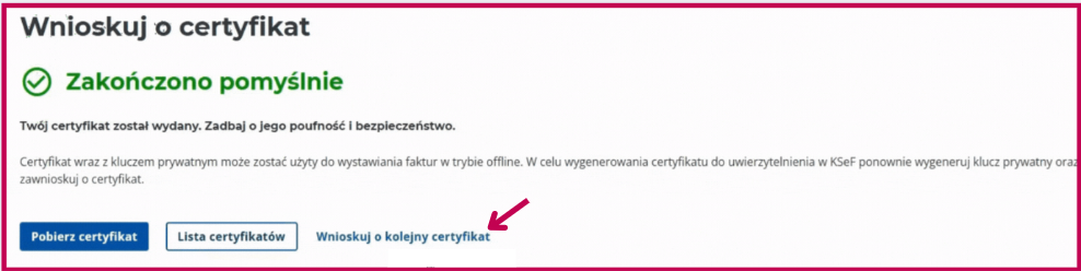 - Wnioskuj o kolejny certyfikat - umożliwi wygenerowanie kolejnego certyfikatu.