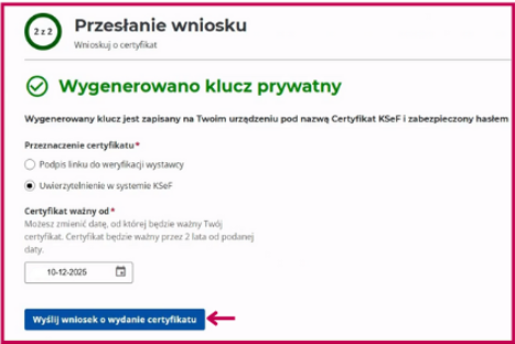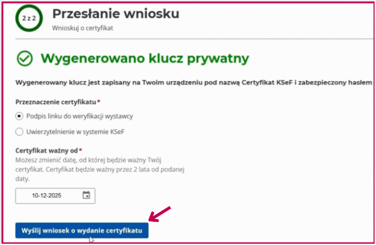5. Na ekranie pojawi się Przesłanie wniosku. Należy wygenerować dwa certyfikaty. W pierwszej kolejności w sekcji Przeznaczenie certyfikatu, wybierz opcję Uwierzytelnienie w systemie KSeF - dla faktur wysyłanych w trybie online.