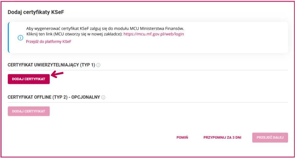 W celu wygenerowania certyfikatu KSeF w Module Certyfikatów i Uprawnień (MCU) zastosuj się do następujących kroków:
