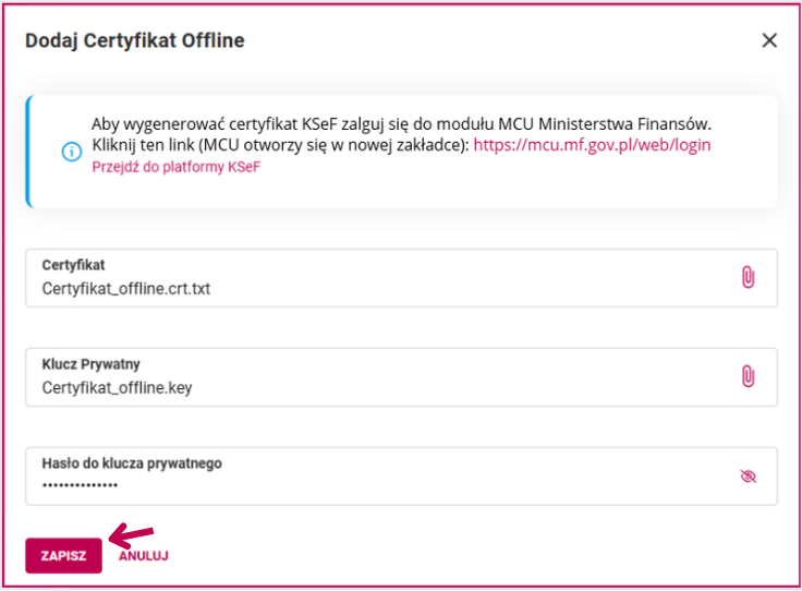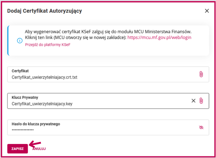 Wgraj certyfikat w formacie .crt, który został wygenerowany w Module Certyfikatow i Uprawnień z przeznaczeniem certyfikatu do Uwierzytelnienia w systemie KSeF. Załącz klucz prywatny w formacie .key. Wprowadź również Hasło do klucza prywatnego, które zostało zdefiniowane podczas generowania certyfikatu oraz zapisz zmiany.