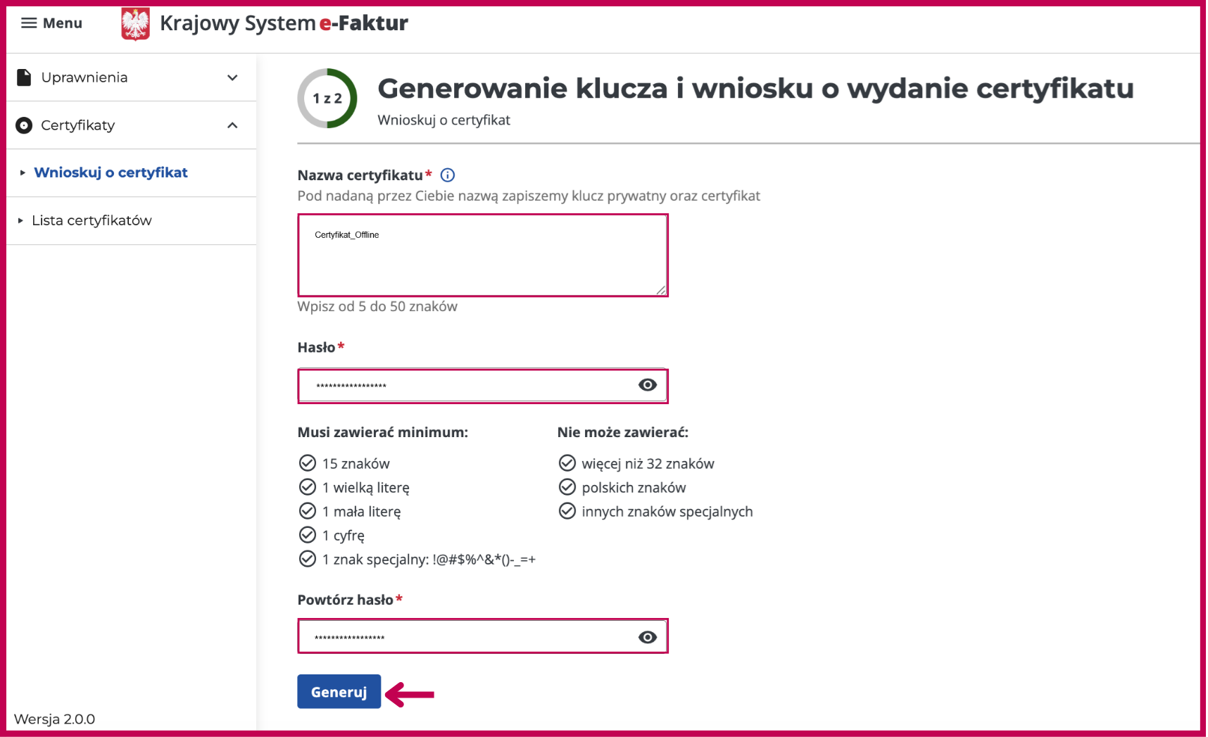 9. Wypełnij dane certyfikatu. Wymagane jest wprowadzenie Nazwy certyfikatu oraz utworzenie Hasła, które będzie zabezpieczać klucz prywatny oraz Powtórz hasło. Wybierz opcję Generuj. Klucz prywatny zostanie automatycznie zapisany na Twoim urządzeniu jako plik z rozszerzeniem .key.
