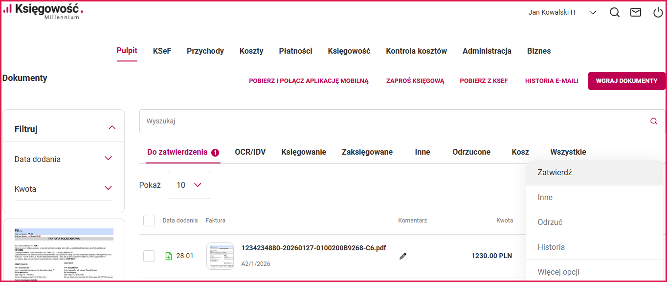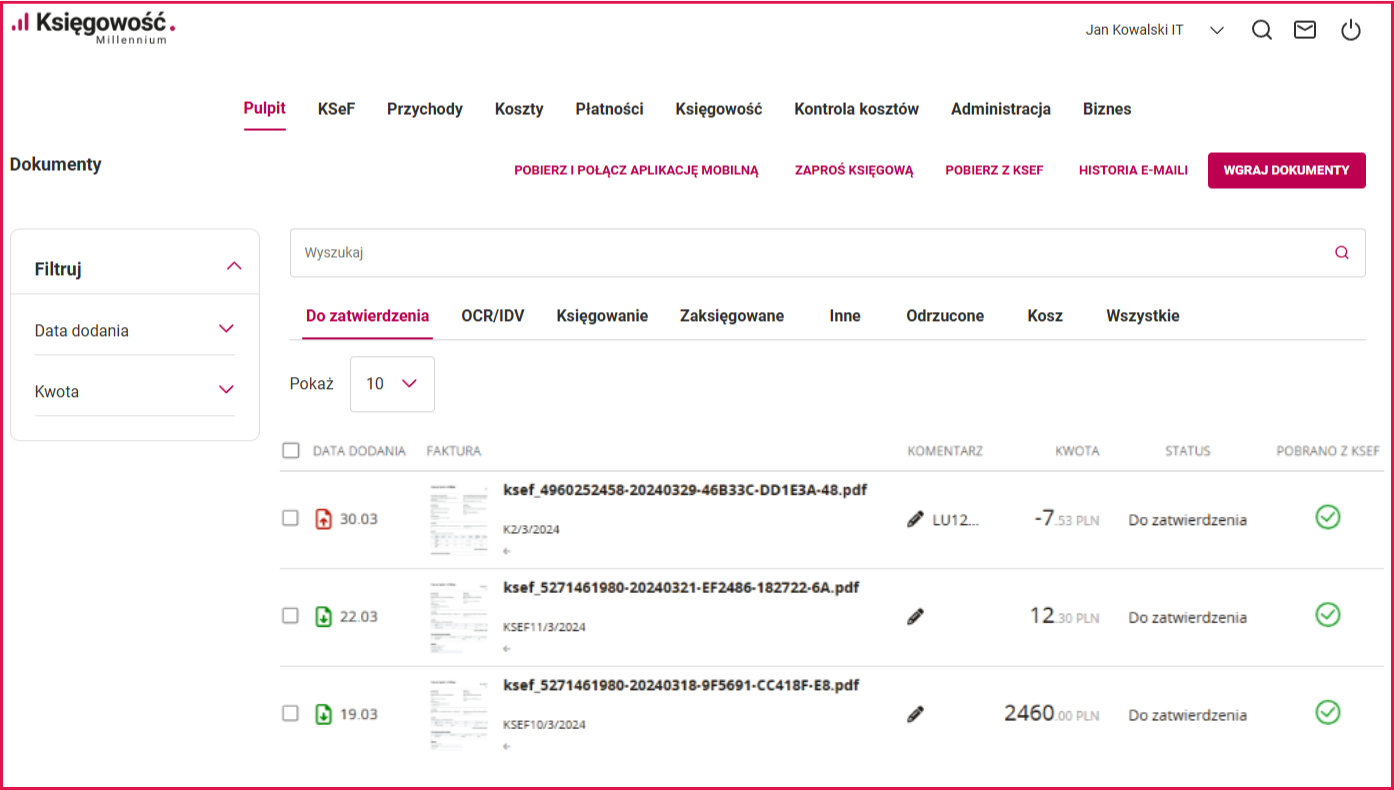 Po przejściu do zakładki Pulpit/eSegregator/Do zatwierdzenia dostępna jest lista wszystkich dokumentów pobranych z Krajowego Systemu e-Faktur automatycznie wraz z nadanym im numerem KSeF ID.