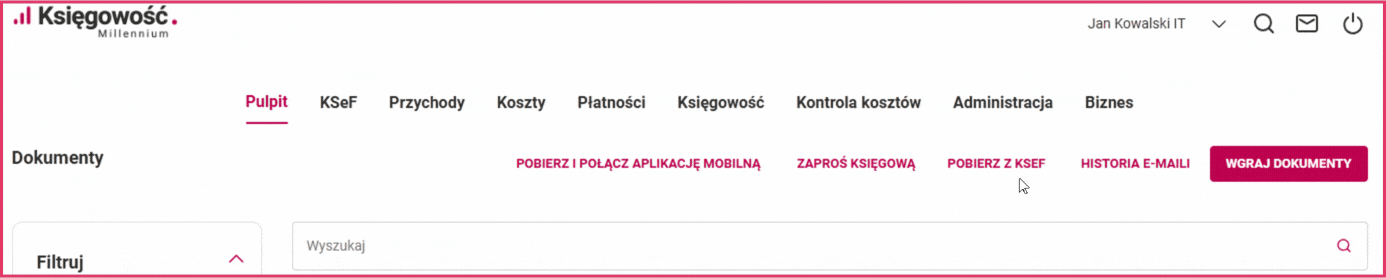 Dokumenty kosztowe, które zostały wystawione dla Twojej firmy i przesłane do KSeF będą zawsze w godzinach nocnych pobierane bezpośrednio z KSeF automatycznie do Millennium Księgowość.